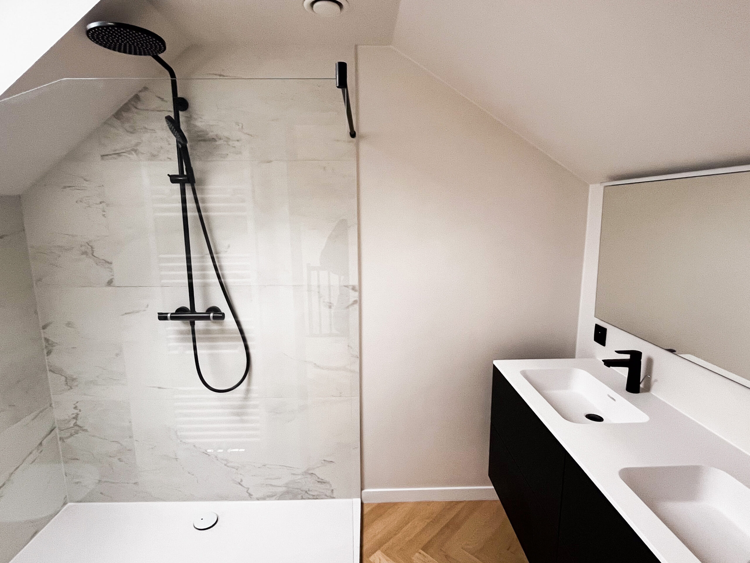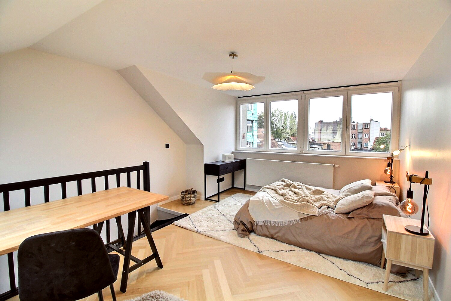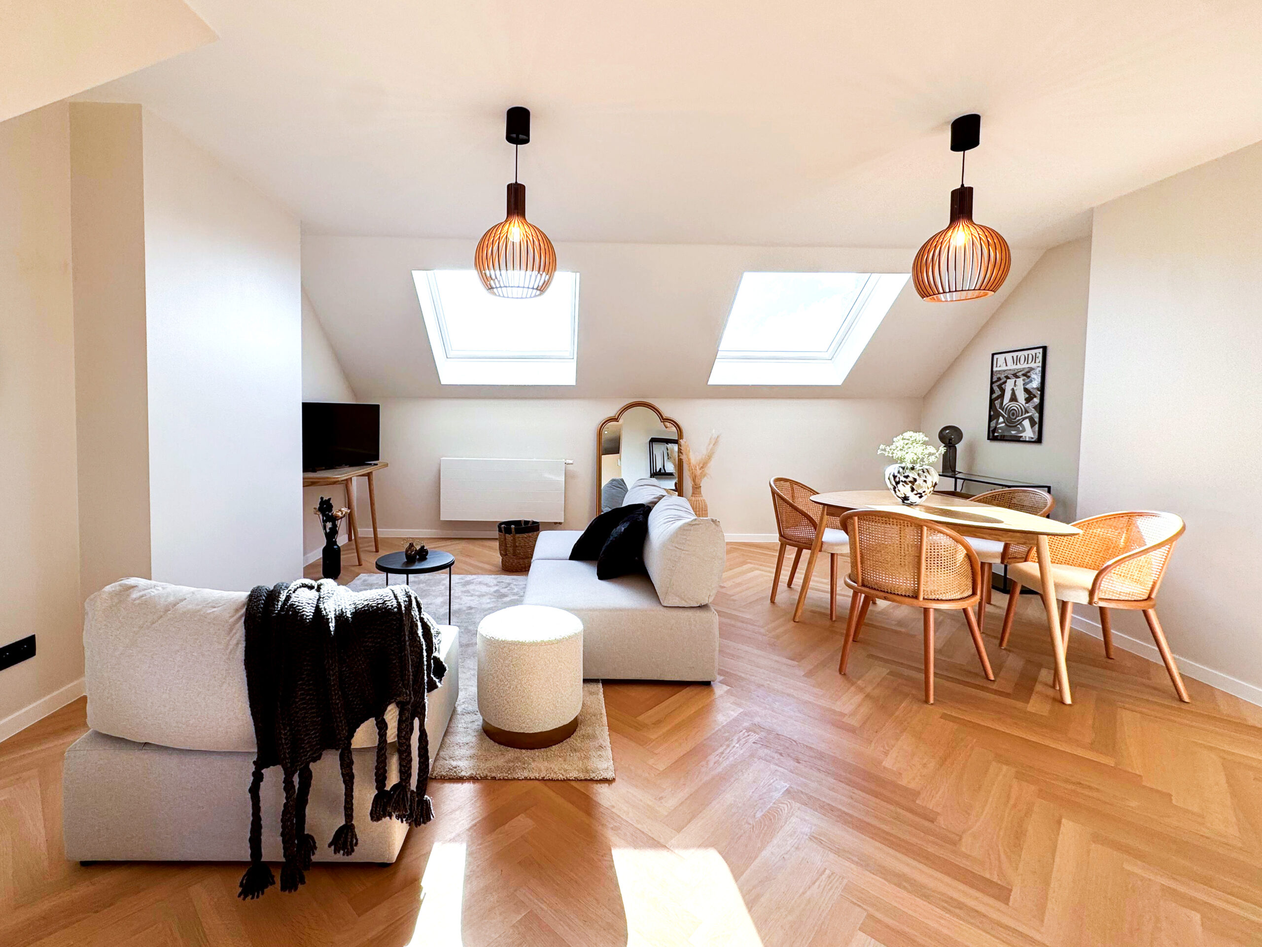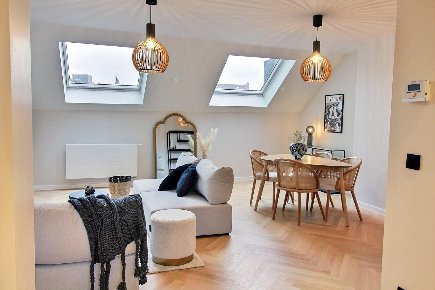 Ce magnifique duplex bruxellois avait été entièrement rénové par le propriétaire : nouvelle peinture, finitions haut de gamme et installation d’électroménager de pointe. Il lui manquait néanmoins un petit aménagement pour que les futurs acquéreurs puissent se projeter instantanément !